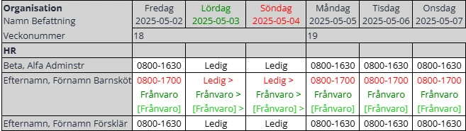 När du klickat på ”Visa blad” så får du upp en sammanställning av din personal enligt nedan. Här kan du se arbetstid, frånvaro, placering, schema och anställning.