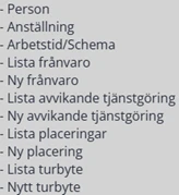 - Nedan val kommer då upp, klicka på den orsak du vill se eller registrera. Då öppnas ett nytt fönster upp och du kan se eller registrera det du önskar direkt från bemanningsöversikten.