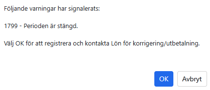 - Ny text: Perioden är stängd. Välj OK för att registrera och kontakta Lön för korrigering/utbetalning.