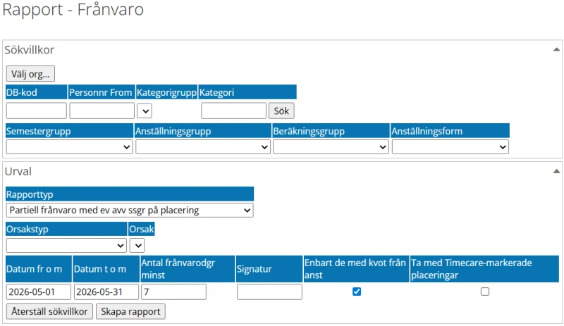 Rapport – Frånvaro: Partiell frånvaro med ev avv ssgr på placering