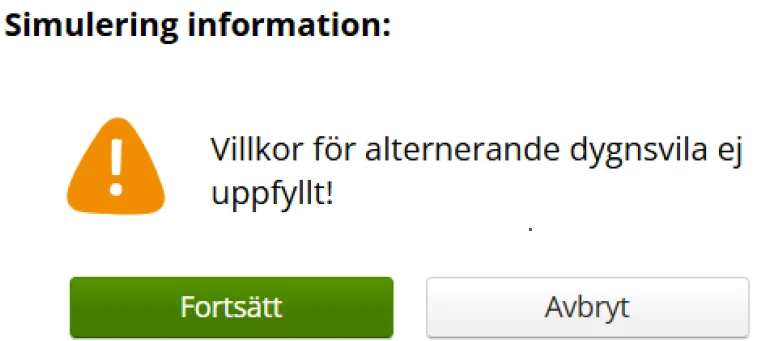 När du klickar på Spara görs en kontroll som säkerställer att det nya passet inte bryter mot viloreglerna i förhållande till de arbetspass som ligger omedelbart före och efter den aktuella posten. Om passet bryter mot viloreglerna så får du en varningssignal.
