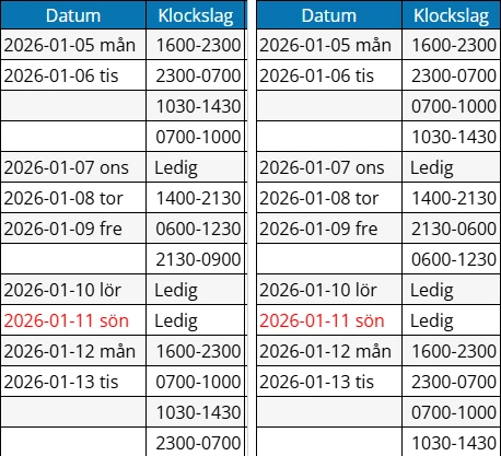 Bilden till vänster visar hur arbetspass tidigare visats i tidutvärderingen, efter uppgraderingen kommer passen att komma i rätt ordning som bilden till höger visar.